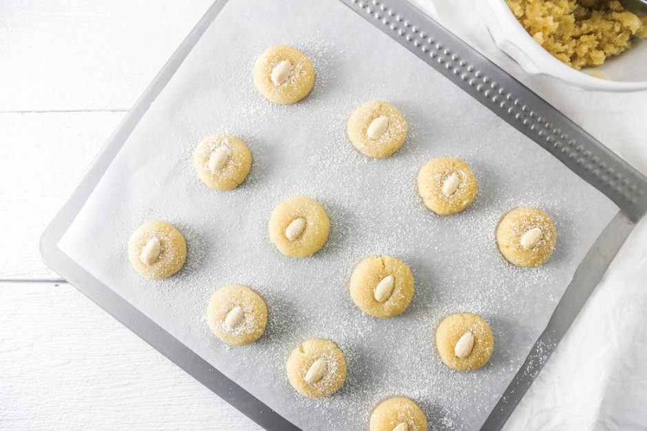 - Using lightly sugared hands, roll the dough into small balls and place on the prepared baking trays. Press an almond half into the center of each.
