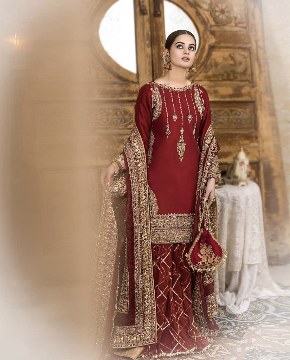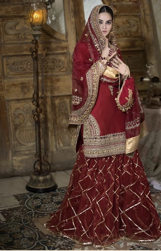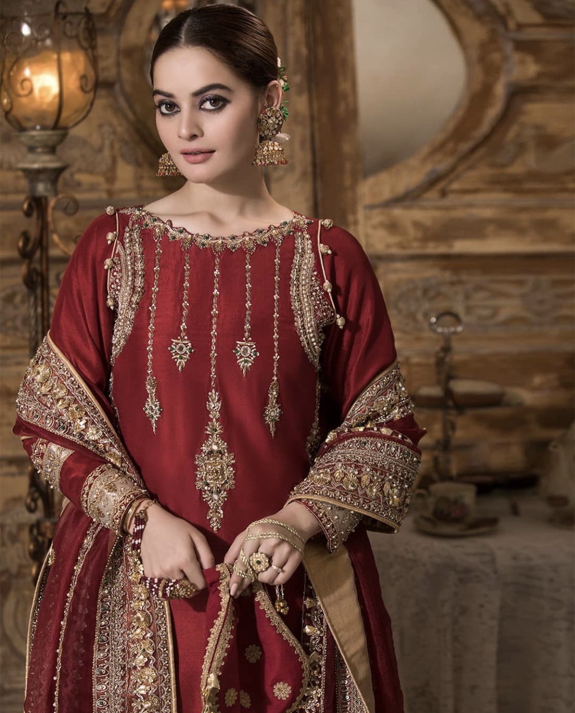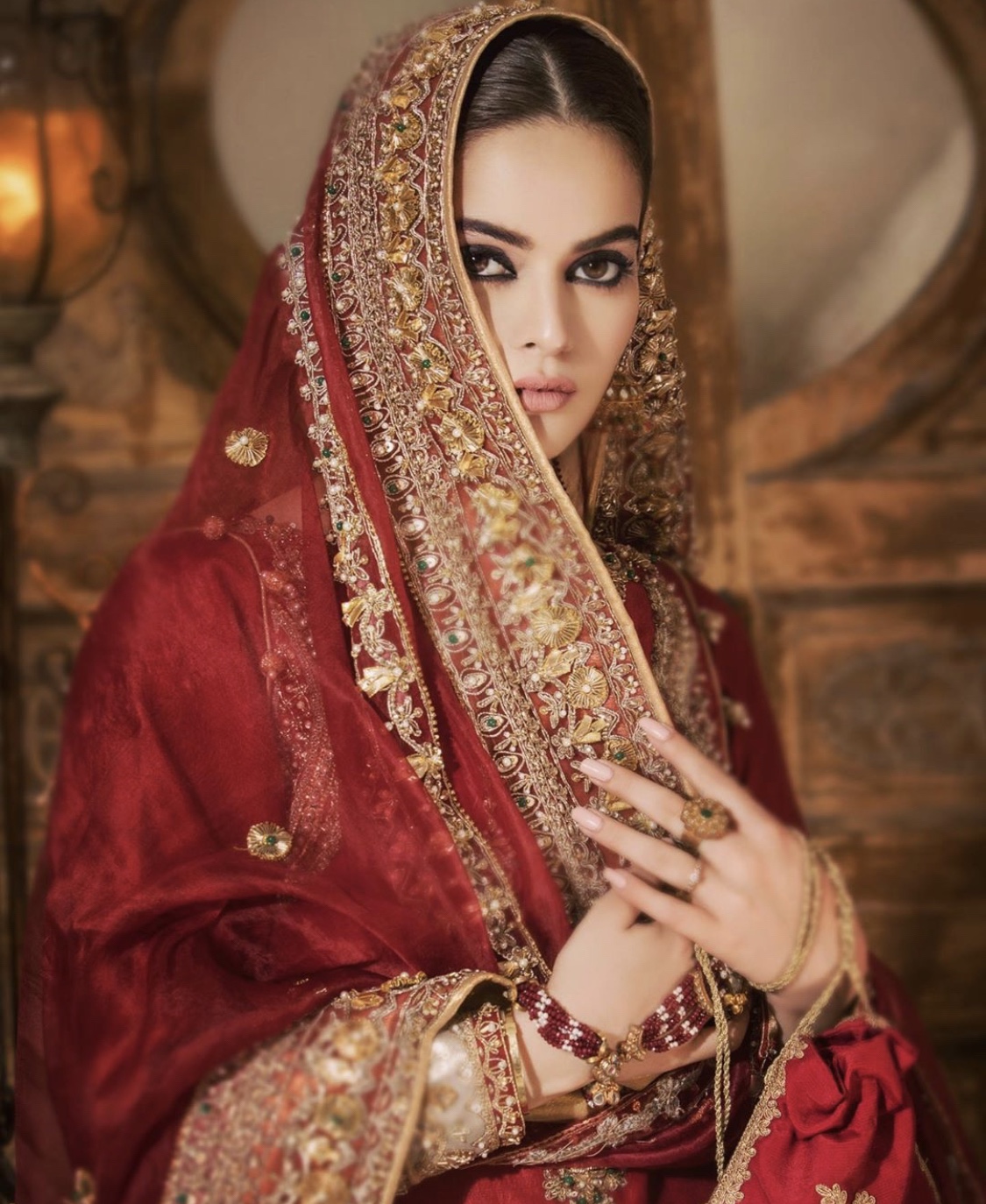 Pakistani Tv actress Minal Khan made her acting debut as a child artist in Kaash main teri beti na hoti and since then appeared in television serials including Quddusi sahab ki bewah, Sun yaara, Hum sab ajeeb se hain, Parchayee, Ki jaana main kaun , Qismaat and Hasad. Currently you can seeing her in TV drama Jalan as nisha. Minal Khan poses for Erum Khan’s new bridal collection “Jan-e-Baharan”. Minal looks absolutely gorgeous in cardinal silk attire.