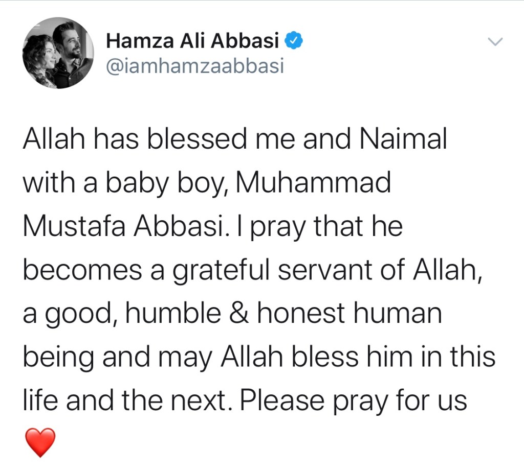 The couple named the baby Mohammad Mustafa Abbasi. Hamza Ali Abbasi and his wife Naimal khawar currently residing in the united state of America. Hamza breaks this amazing news today via his social media. Hamza Ali Abbasi and Naimal khawar got married last year in August. The couple shocked the Pakistani audience with the news of there marriage and received a huge amount of love from the Pakistani fans. Once again many many congratulations to the new parents.