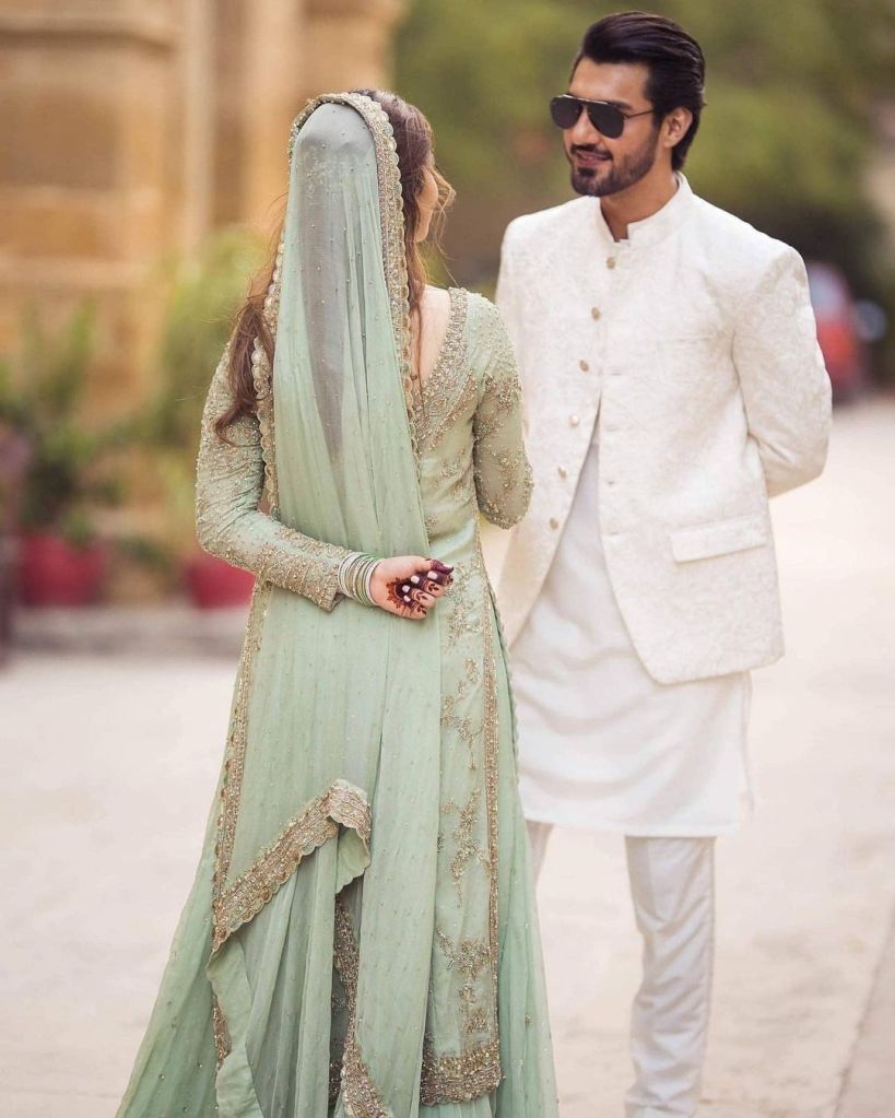 Minal carried a pastel green-colored attire by Erum Khan Couture, and Ahsan Moshin Ikram wears off-white Kurta and trouser designed by the maestro Humayun Alamgir. Here some latest pictures of Minal Khan and Ahsan Mohsin Ikram engagement.