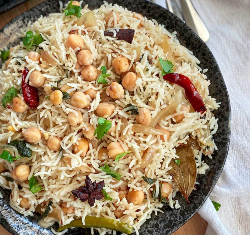 - Cook the rice and chickpeas on high heat, Once the water has dried out, heat down to the lowest setting, add nutmeg mace and steam for 10-15 minutes.