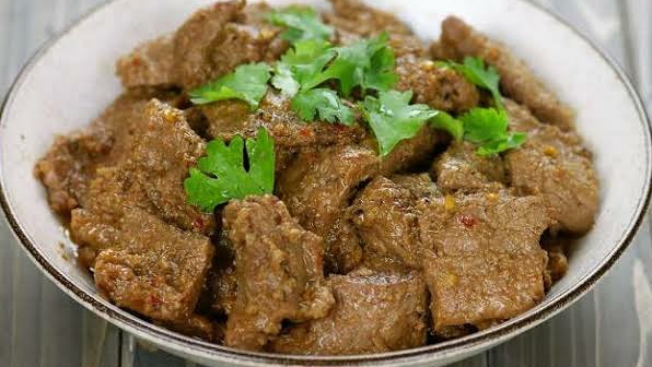 Place beef in a mixing bowl Add: roasted basan/gram flour, cumin, coriander roasted powder, red chilli powder, turmeric powder, red chilli flakes, green chilli paste, raw papaya paste, ginger garlic paste, and yoghurt. Marinate for 30 minutes