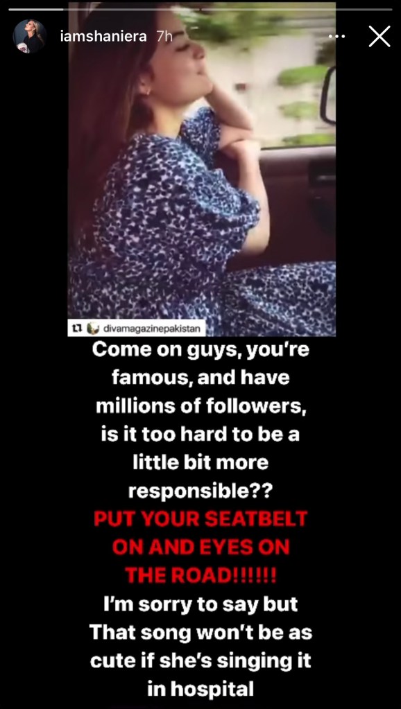 she wrote “Come on guys, you’re famous, and have millions of followers, is it too hard to be a little bit more responsible? Put your seatbelt on and eyes on the road! I’m sorry to say but that wont be as cute if she’s singing it in the hospital”.