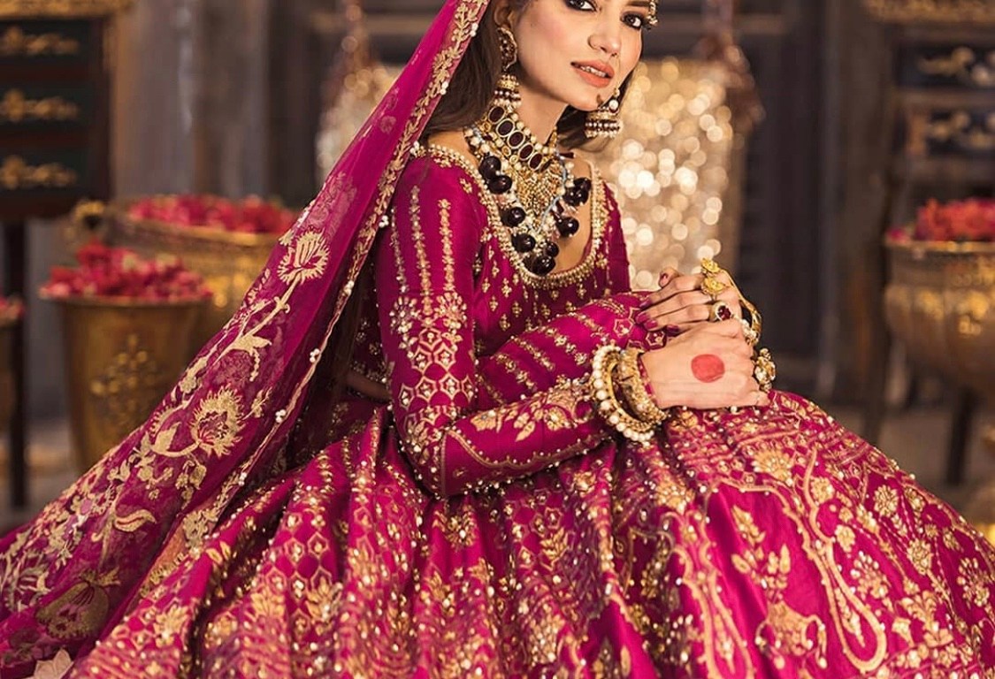 Rabia Butt looks extremely gorgeous in Swabi bridal outfit. she was wearing A Magenta pink raw silk lehanga choli is incrusted with pearls, sitara and naqshi in gold. It is paired up with a net dupatta with gorgeous floral aari work.