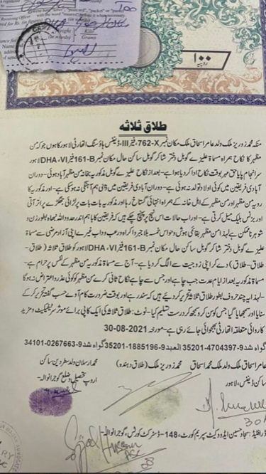 Letter on, Zoraiz Malik mother Aasia Amer verified that her son Zoraiz and Alyzeh’s divorce news via her social media account. She shared the proofs that Zoraiz Malik has divorced Alyzeh Gabol.