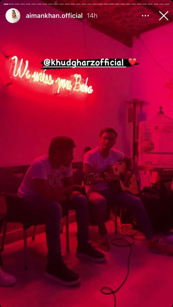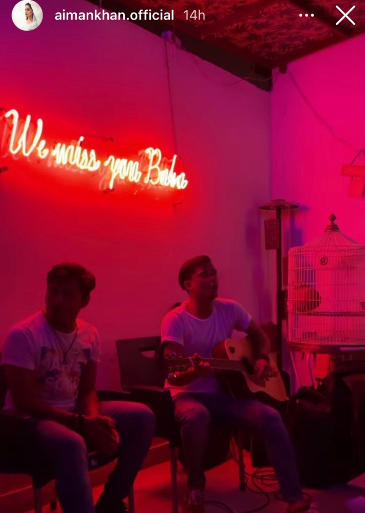 On Thursday, one day after the Mayun ceremony the bride and groom sat in for a sing-along with their loved ones. Minal Khan turned to her Instagram to document the day. One could spot LED lights reading “We Miss You Baba” in the background behind a local band that swooned the couple with their songs.