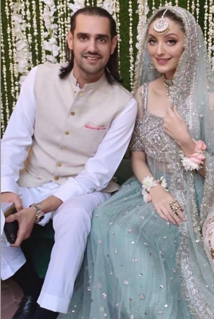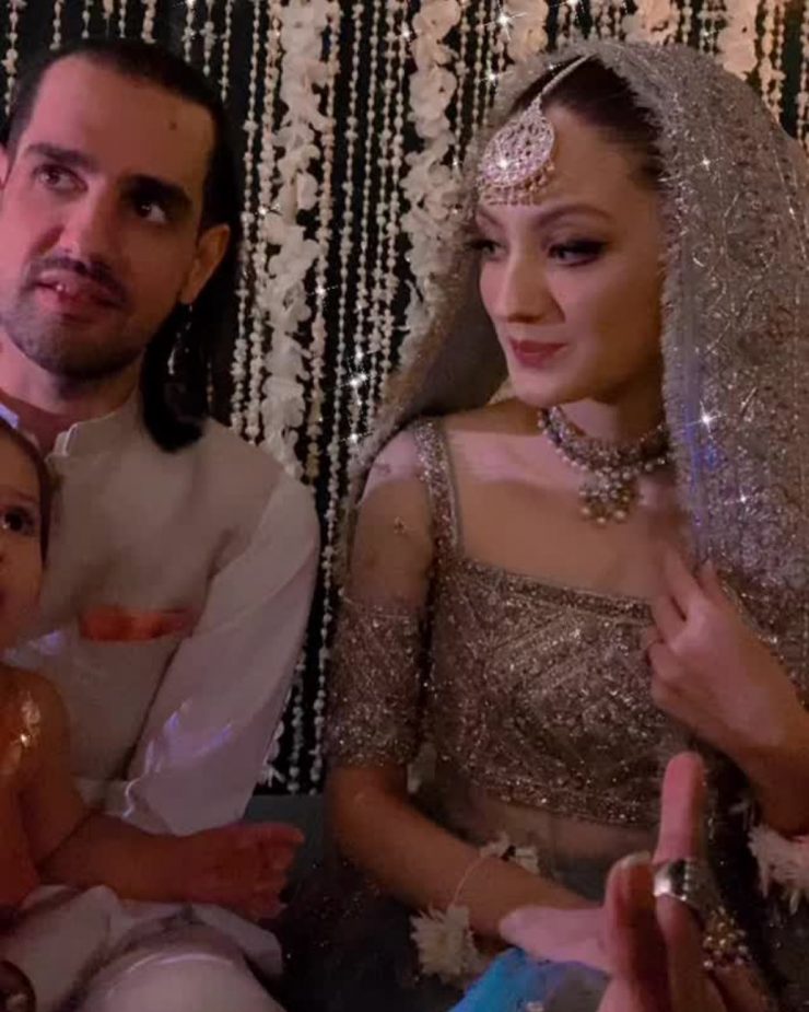The couple was joined by friends and family for an intimate nikkah ceremony on Friday. Neha Rajpoot looks absolutely stunning in an icy blue outfit by Hussain Rehar. Neha wore flower garland on her hands and kept her jewellery and makeup minimal, with the exception of a bold eyeliner that complimented her eyes. Salman Taseer wore a simple white sherwani with a beige waistcoat with a pink handkerchief.
