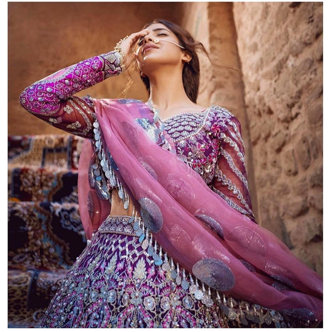 The beautiful Sonya Hussyn recently poses in pale purple coloured bridal Jora by Maryam Hussain. Take a look at some of her exclusive clicks in bridal attire which is beautifully embellished with silver embroidery on pale purple based.