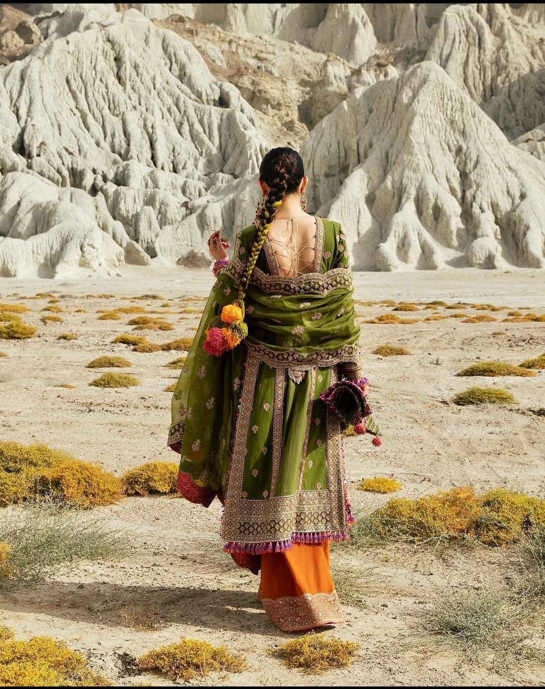 A fascinating moss green and orange ensemble with dazzling embroideries on the panels of the front, back, and sleeves of the shirt. The alluring embroideries of the motifs include satin, tatami, zigzag, E-stitch, contour, and stem stitch. It’s paired with an orange trouser with embroidered border and an alluring organza dupatta further enhanced with beautifully embroidered pallu. The printed finishing for the shirt in satin silk gives an impeccable overall look to the stunning attire.