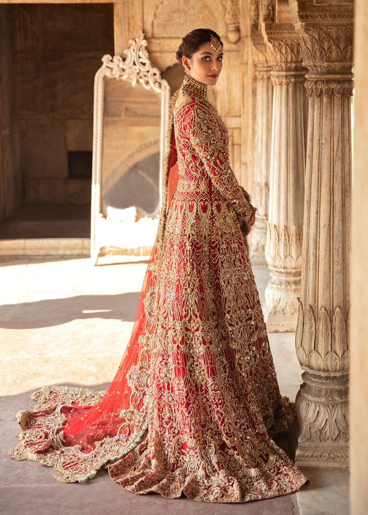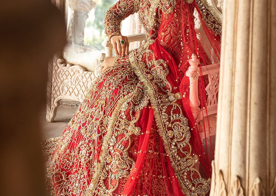 Pakistani star and style icon Ayeza Khan is known for her acting skills and charismatic personality. This time she poses for Kanwal Malik’s Bridal campaign. The classic red bridal, Jhomar features a beautiful handcrafted net gown with embellishments in gold and silver. It is accompanied by a net dupatta with a heavily adorned border, and heavier embellishment on the pallu, with large scallops.
