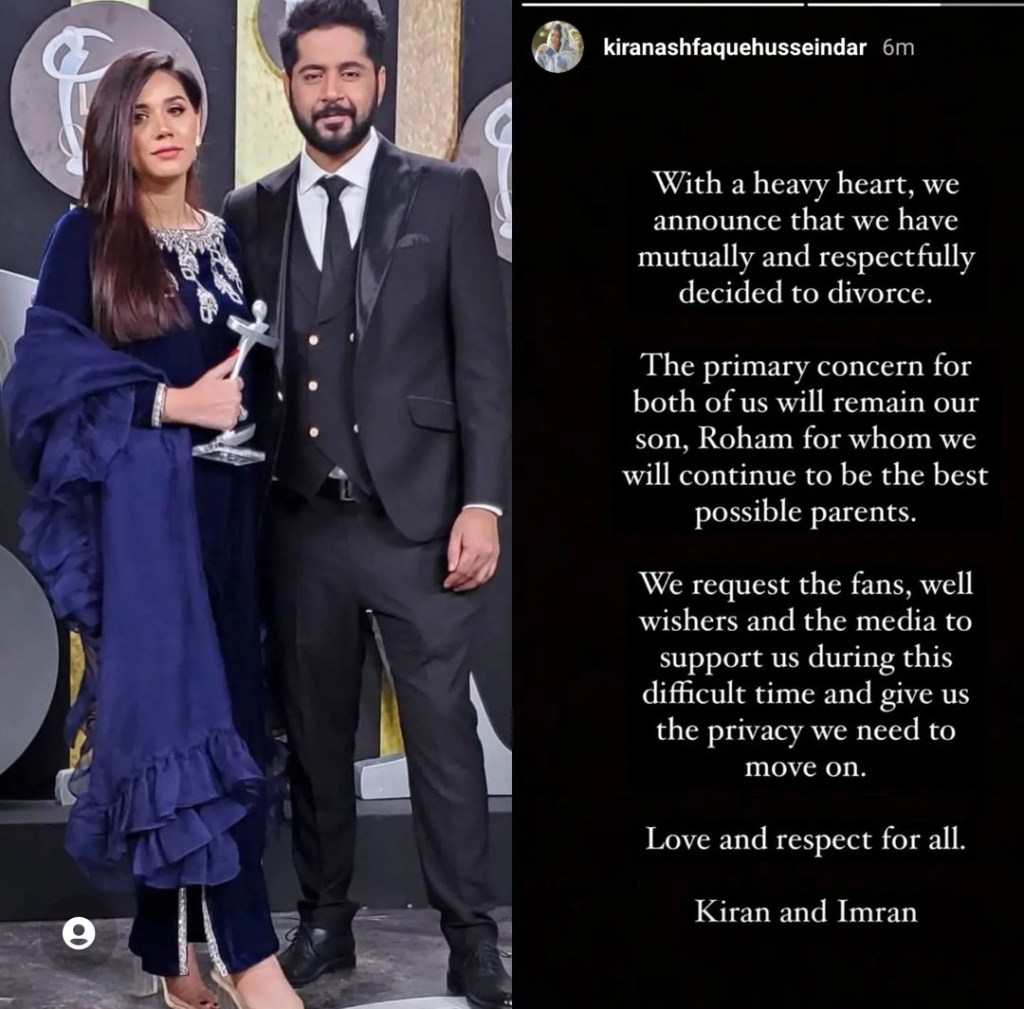 Imran Ashraf and his ex-wife Kiran Ashfaque realize a joint statement on Instagram With a heavy heart, we announce that we have mutually and respectfully decided to part ways,” their Instagram post read. “The primary concern for both of us will remain our son, Roham for whom we will continue to be the best possible parents.”